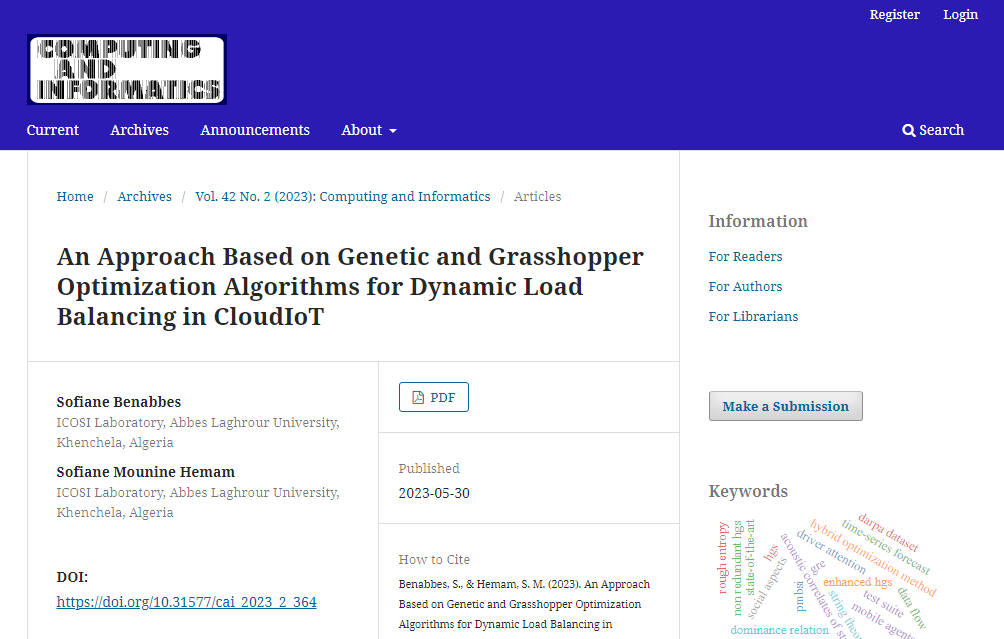 Benabbes, S., & Hemam, S. M. (2023). An Approach Based on Genetic and Grasshopper Optimization Algorithms for Dynamic Load Balancing in CloudIoT. COMPUTING AND INFORMATICS, 42(2), 364–391. https://doi.org/10.31577/cai_2023_2_364